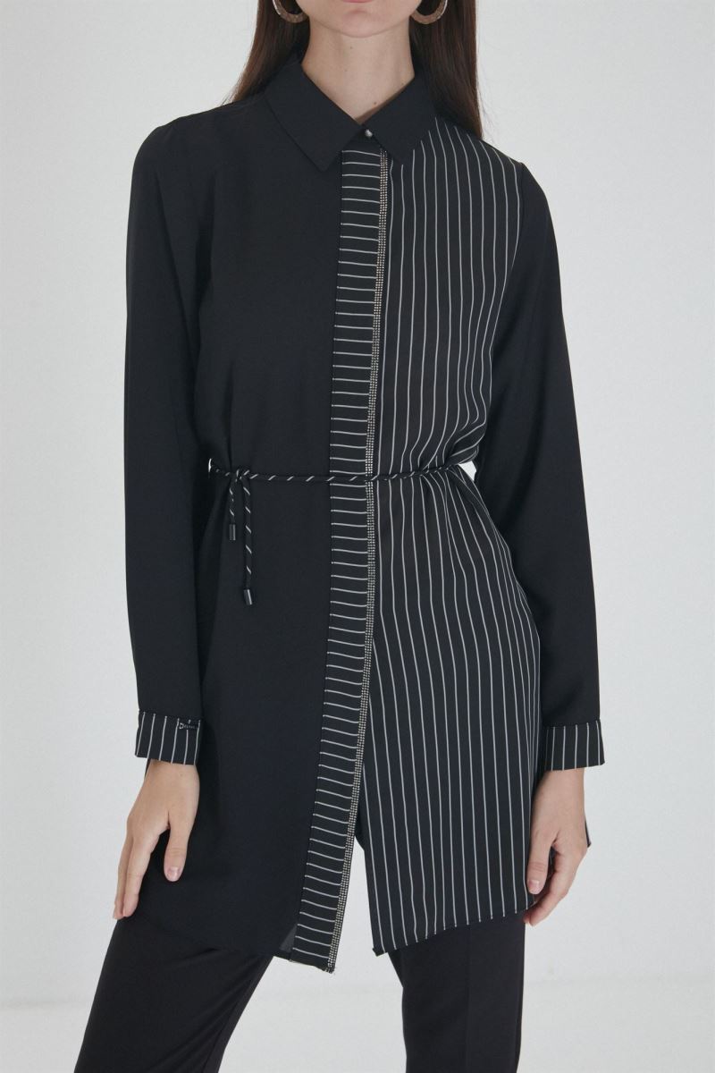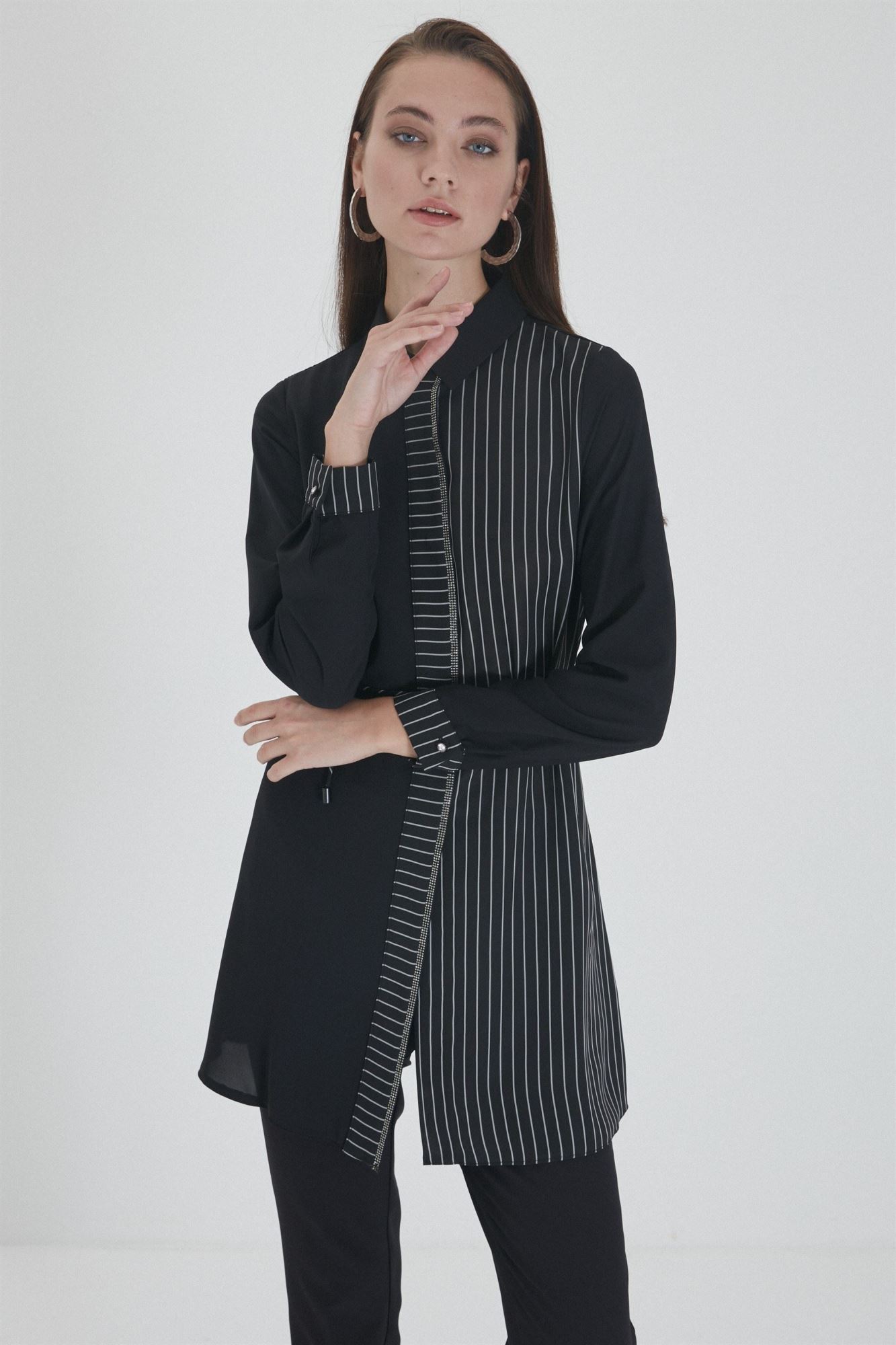 CAM GÖBEĞİ GÖMLEK YAKA ÇİZGİLİ SİYAH TUNİK