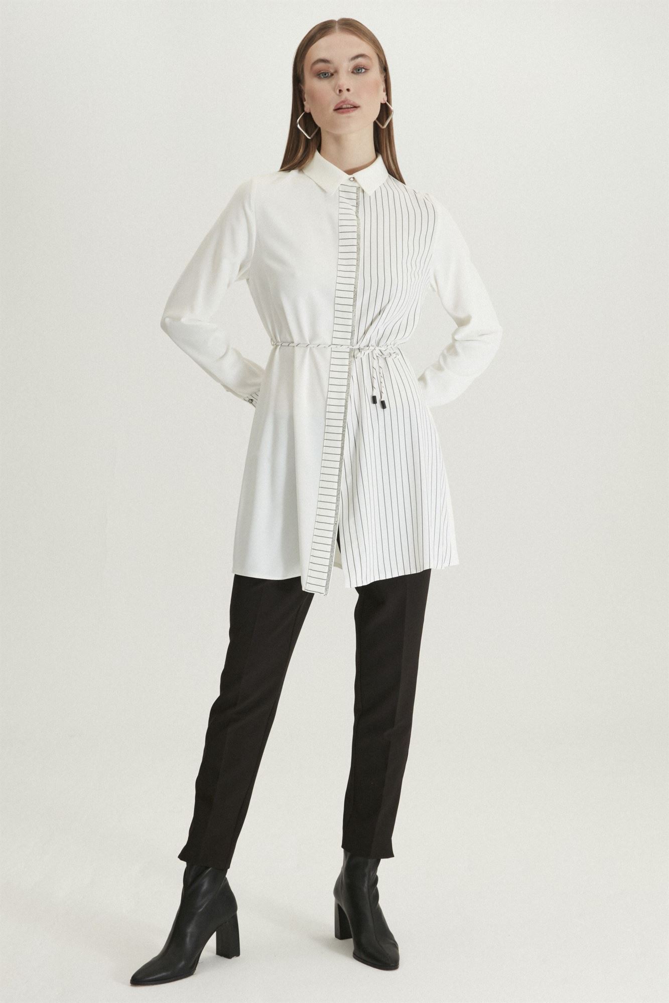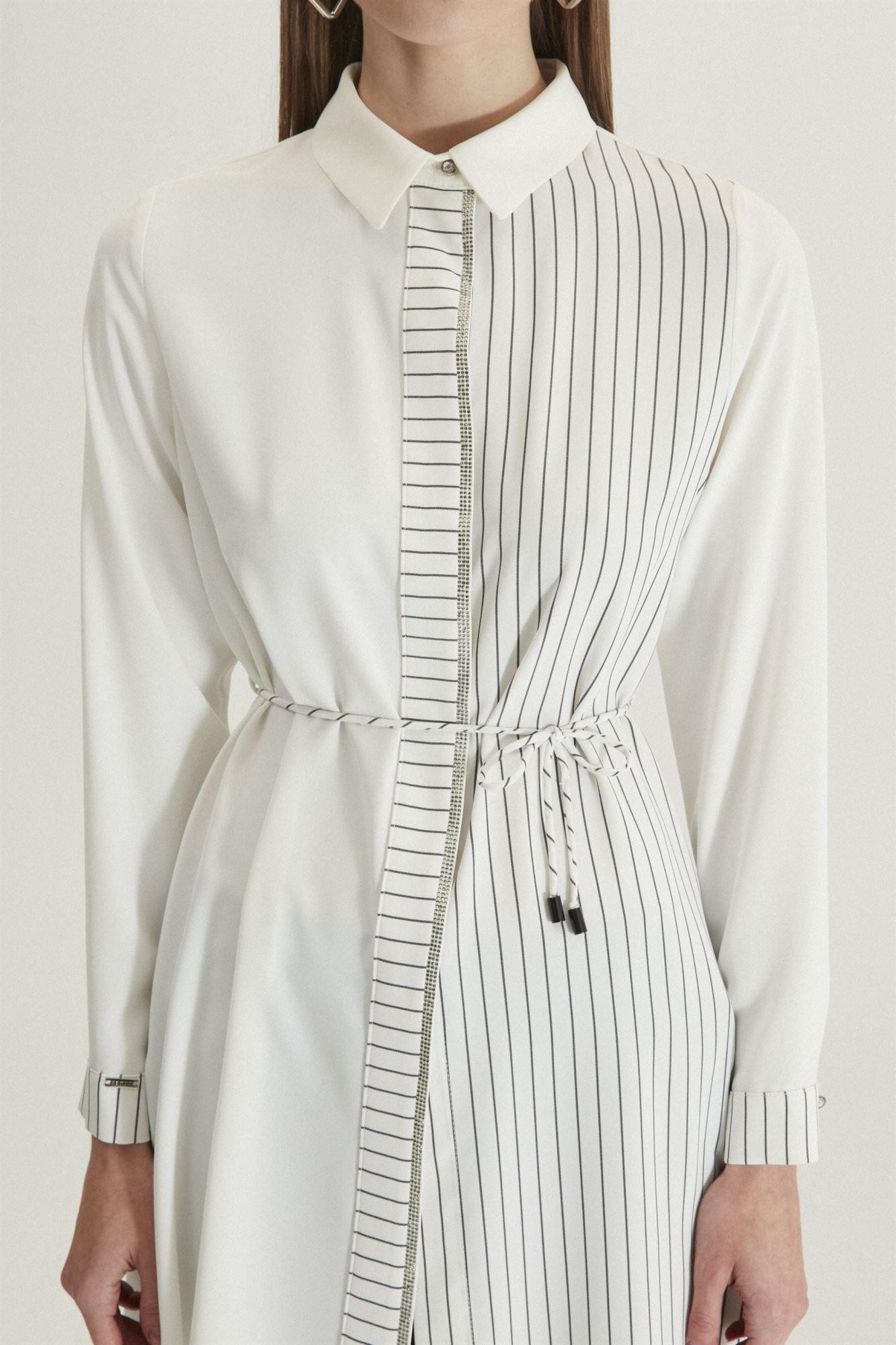 SİYAH GÖMLEK YAKA ÇİZGİLİ EKRU TUNİK