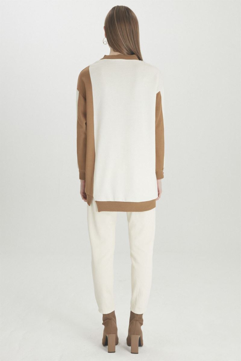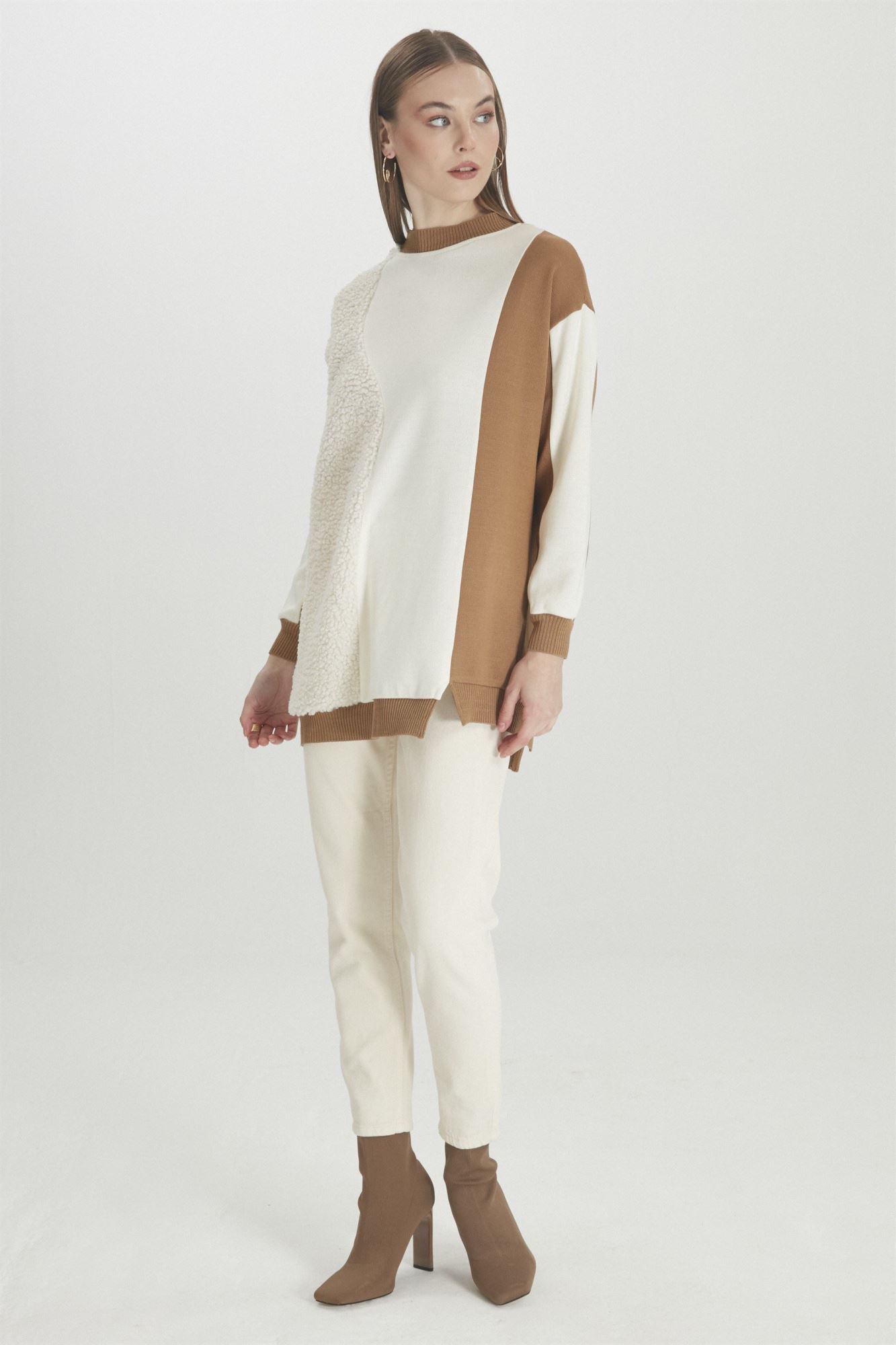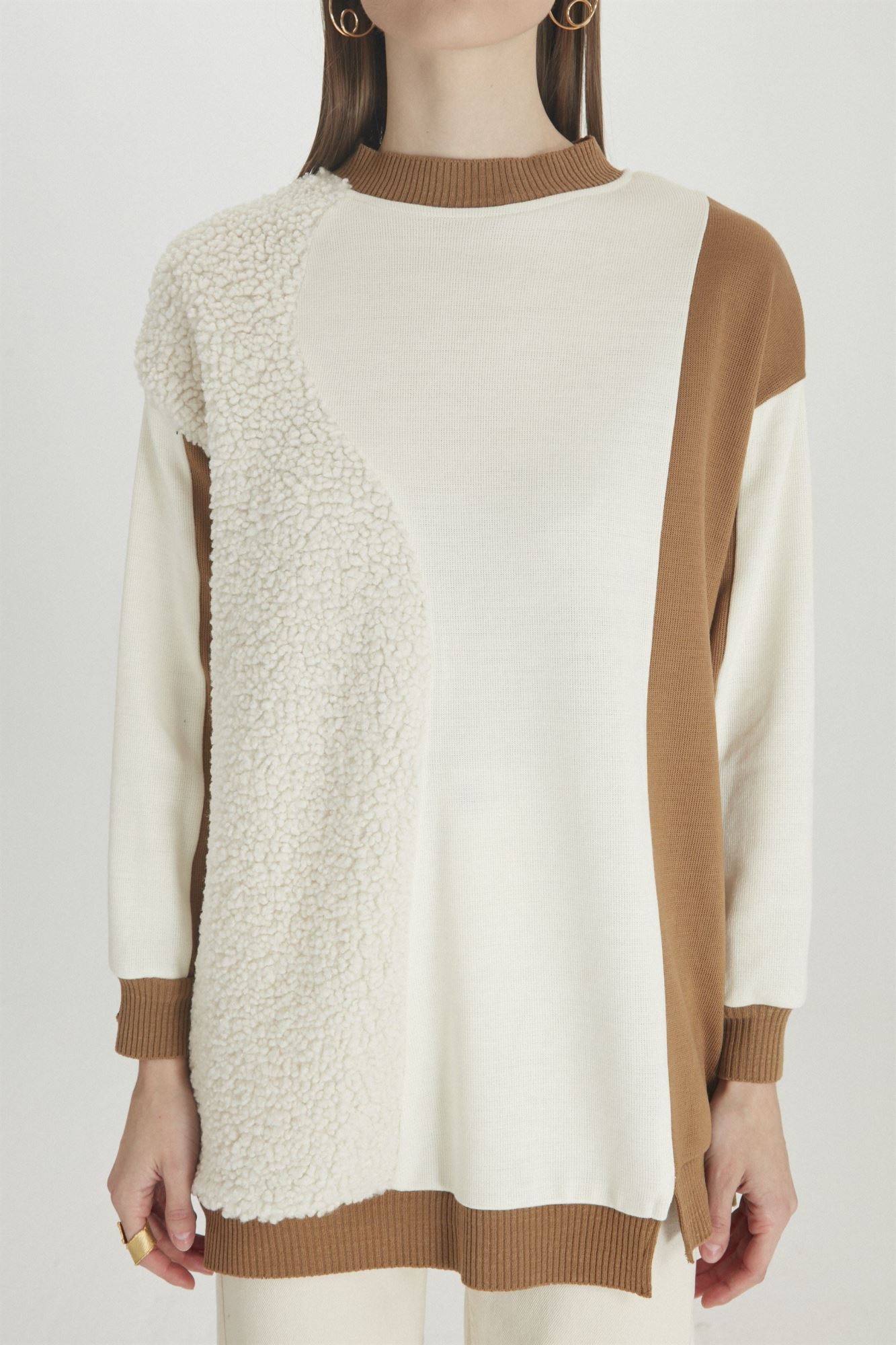 SİYAH RENK BLOKLU PELUŞ DETAYLI CAMEL TUNİK