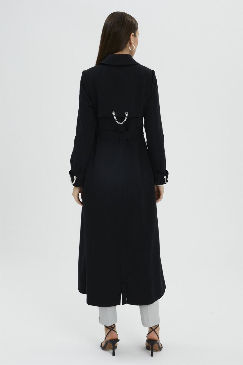 SİYAH ZİNCİR VE KEMER DETAYLI SİYAH TRENÇKOT